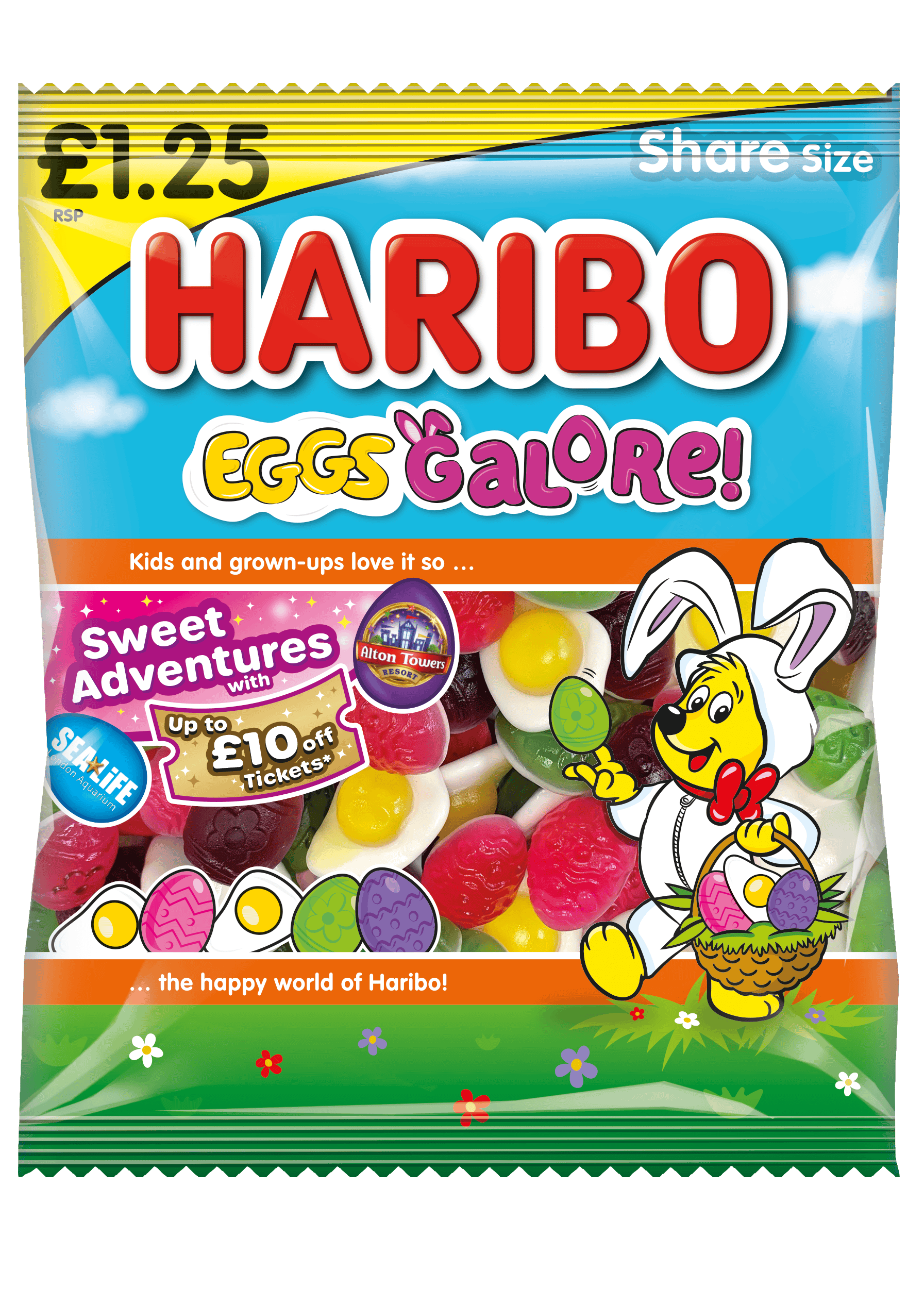 Get eggcited for Easter with the wholesale Haribo Eggs Galore! 140g bags. Each bag features the ever-popular fried egg sweets along with fruit flavoured gummy sweets in Easter themed shapes.