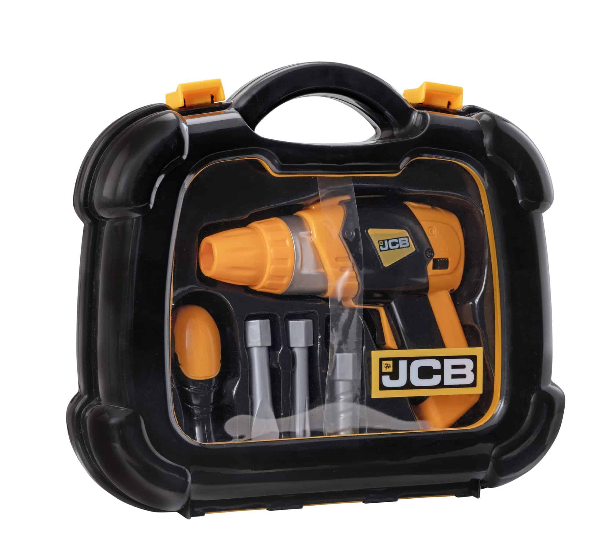 - Durable portable JCB tool case which includes drill bit, flat head and cross head accessories which all pack away neatly after hours of imaginative fun!
