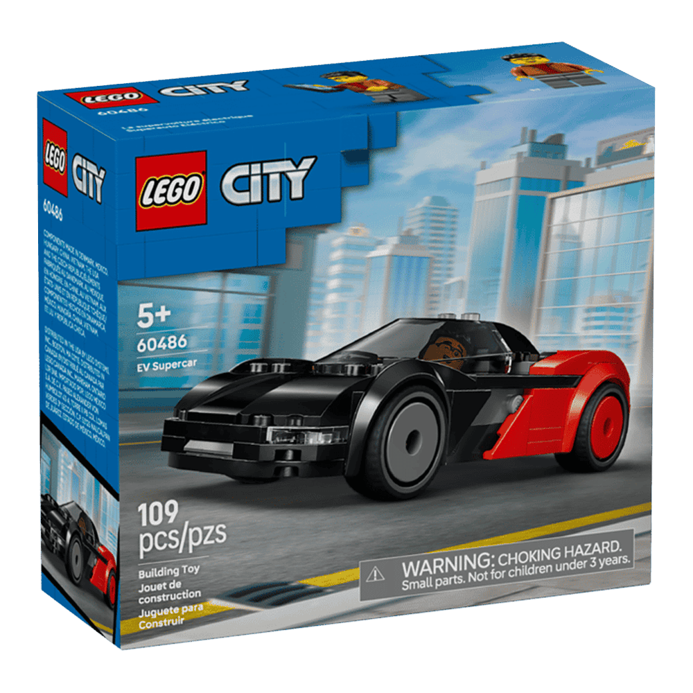 The LEGO City EV Supercar is a fun toy that lets kids build their own electric sports car. This LEGO City set features a bold red-and-black EV design with low-profile tyres, modern styling and an opening rear hatch that reveals the battery pack. It also includes a driver minifigure for racing adventures.