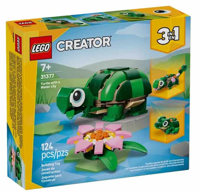 Kids can enjoy building and playing with a cute turtle model complete with a pretty pink water lily, then transform the same bricks into a chameleon or a frog for even more creative storytelling.