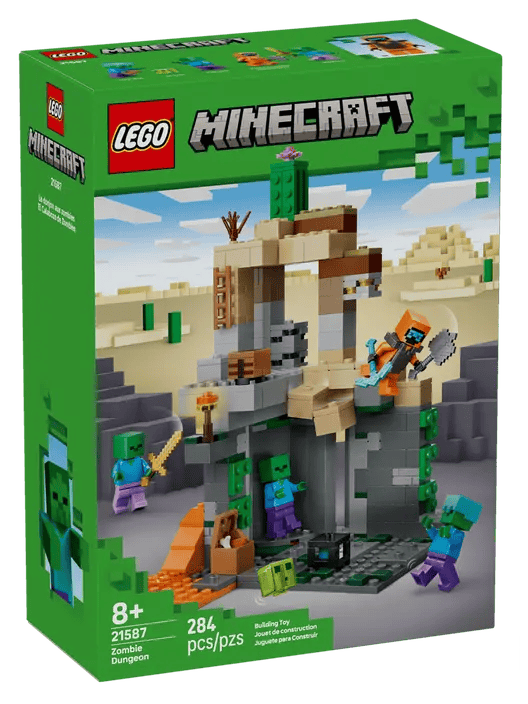The LEGO Minecraft Zombie Dungeon set plunges builders into action packed dungeon adventures with a dynamic desert biome build filled with a rotating zombie spawning chamber, a sliding rockfall trap and authentic game inspired elements.
