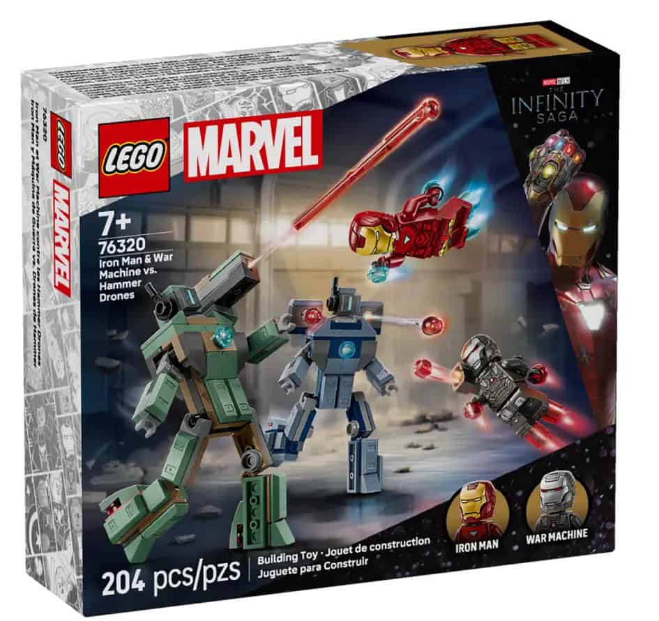 Electrify your superhero offering with the LEGO Marvel set that reimagines a classic Iron Man II showdown. This compact build features Iron Man and War Machine taking on two buildable Hammer Drones with poseable action.