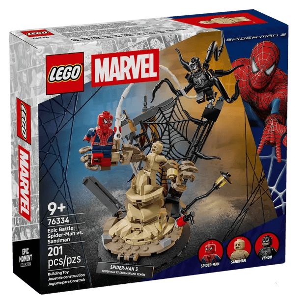 The LEGO Marvel Epic Battle: Spider Man vs. Sandman set recreates an iconic showdown from Spider Man 3, featuring a dynamic buildable scene with Spider Man swinging into action on a web rope, the ever shifting Sandman emerging from rubble with a supersized arm, and Venom striking with his four movable tentacles, complete with a sturdy base for display or imaginative battle play between these legendary characters.