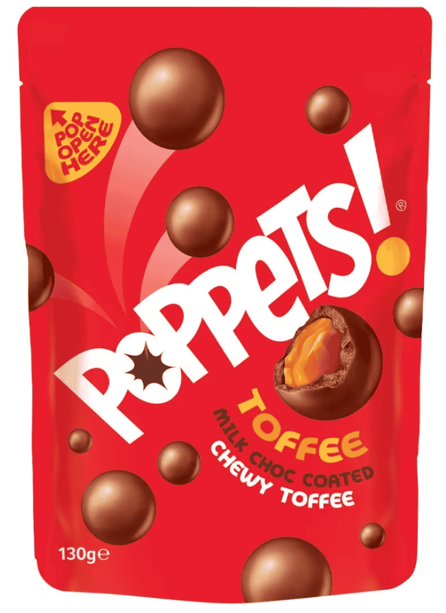 - 9 x 130g Poppets! Milk Chocolate Coated Chewy Toffee Bags