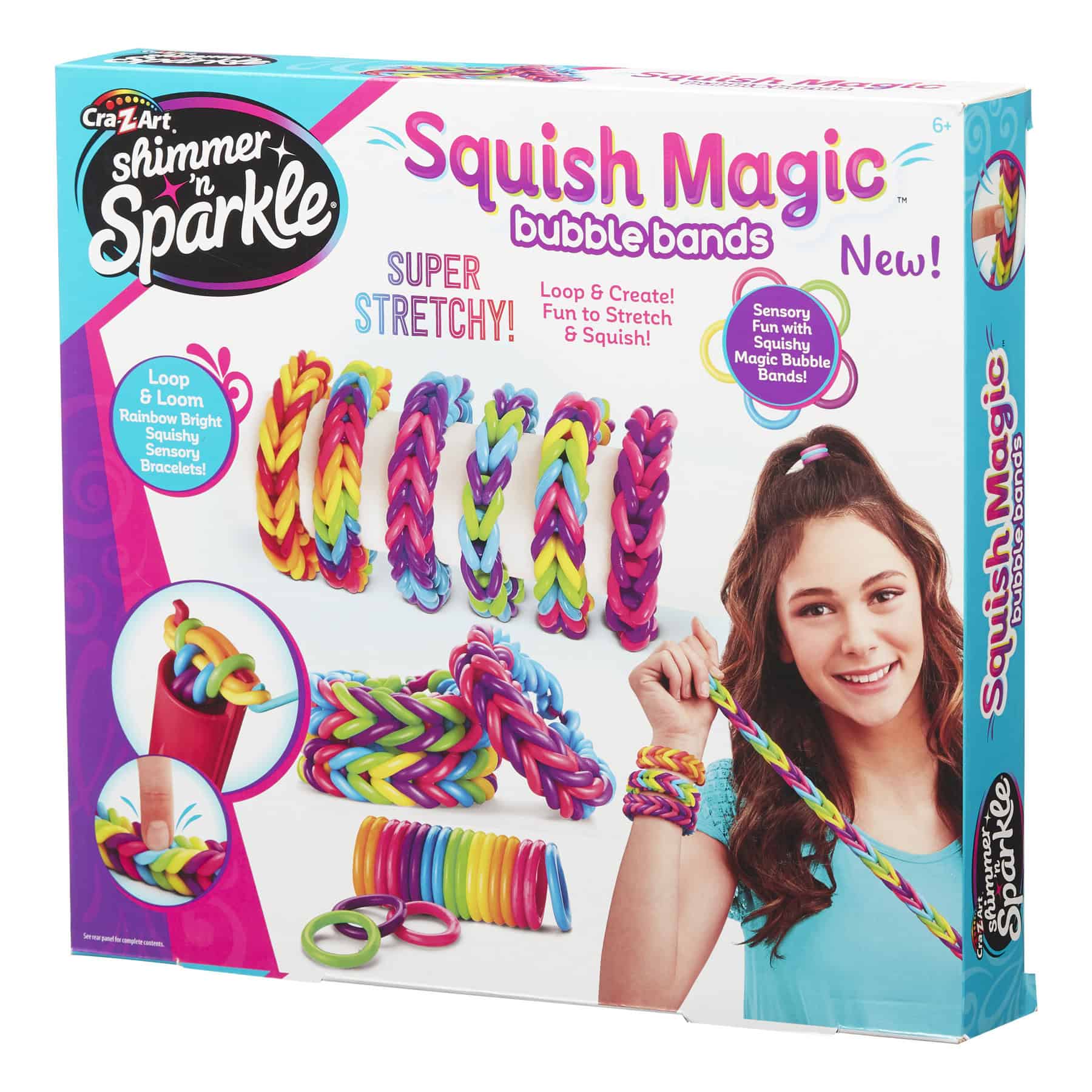 - The Shimmer N Sparkle Magic Bubble Bands set includes a 2-prong loom, a mini weaving hook, 100 latex-free squish bands, 15 “C” hooks and a instruction booklet.