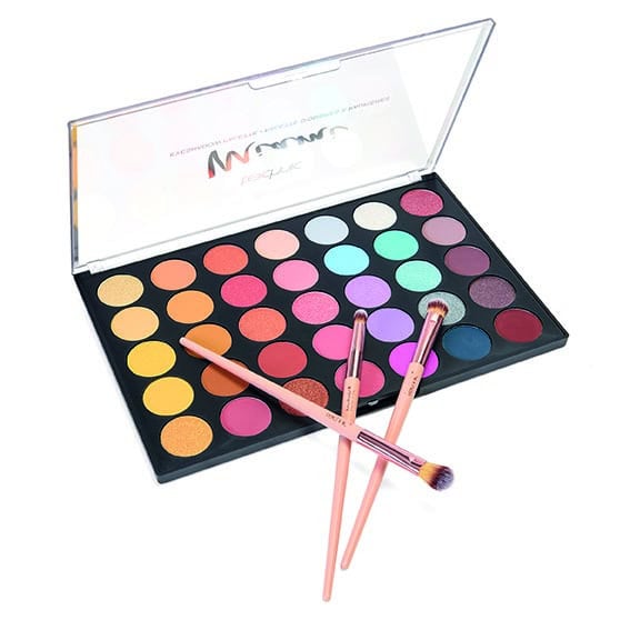 - Includes a 35-shade eyeshadow palette with bright mattes, shimmers, and metallic tones featuring tropical and neon colours
